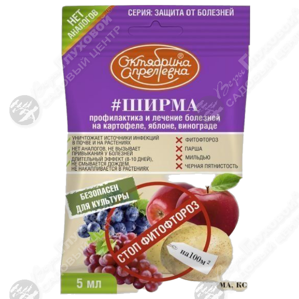 Ширма – Высокоэффективный контактный фунгицид, предназначенный для борьбы с фитофторозом картофеля, паршой яблони, милдью и черной пятнистостью виноградной лозы.